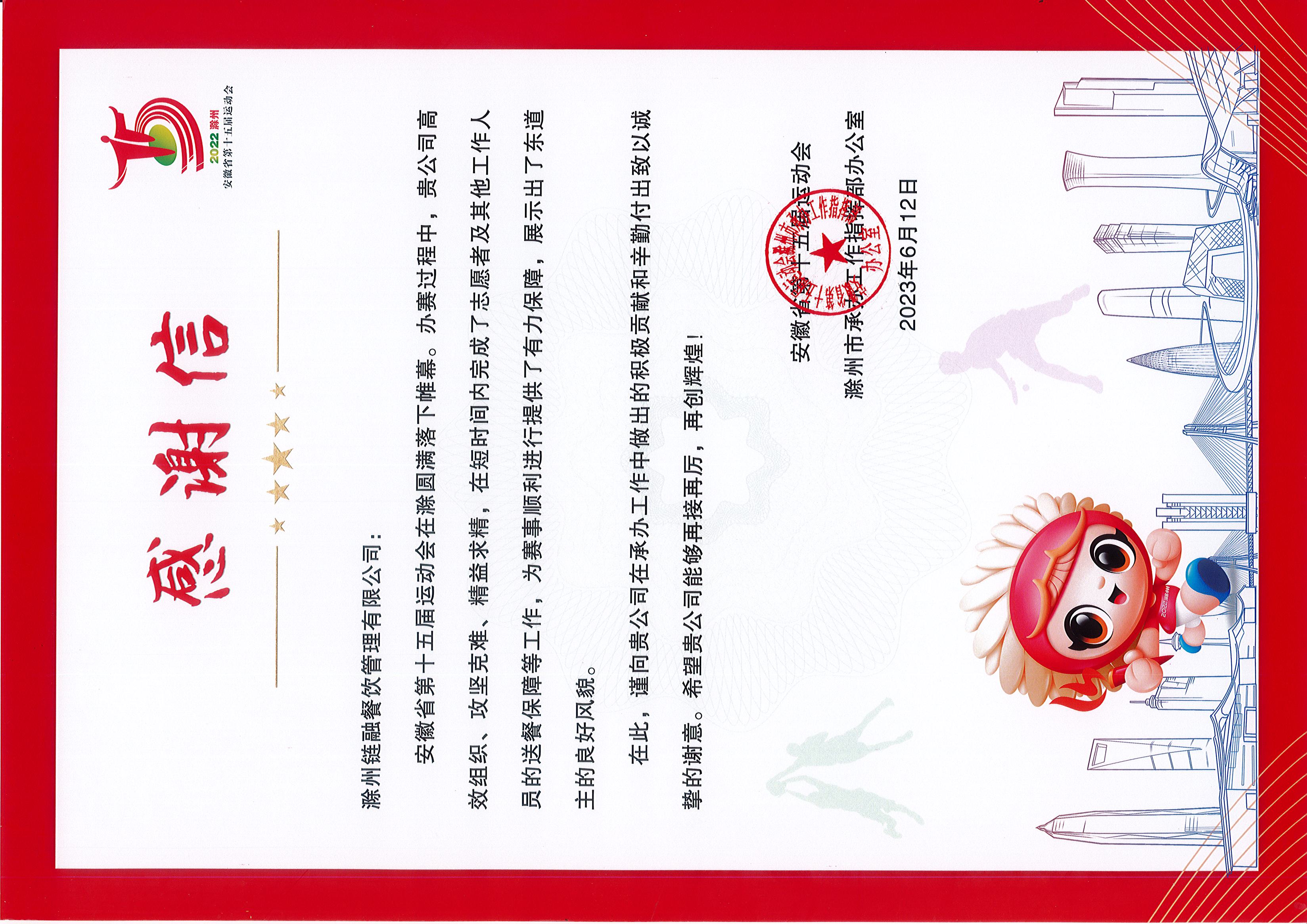 2024年2月1日,我公司收到来自安徽省第十五届运动会滁州市承办工作指挥部办公室的感谢信。信中表示:滁州链融餐饮管理有限公司在办赛过程中,高效组织、攻坚克难、精益求精,在短时间内完成了志愿者及其他工作人员的送餐保障等工作,为赛事顺利进行提供了有力保障,展示出了东道主的良好风貌。